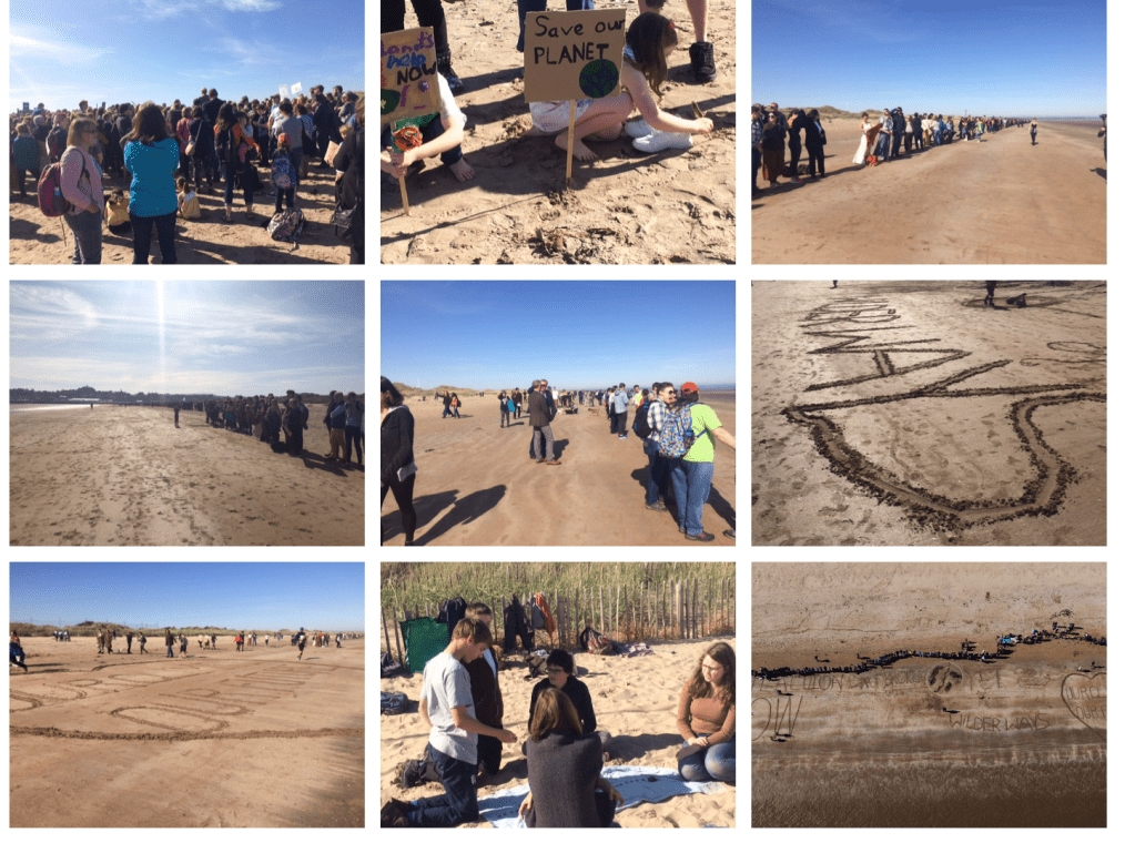 We arrived to West Sands beach early to help prepare the area for a Climate Change march coming from the centre of St Andrews town today. The march was loud and triumphant and we were there ready to greet the large snaking line of people with the sand art we had been working on all morning. The art and writing we worked on represented the goals of the campaign, which was being observed around the world today in cities, towns, schools and workplaces and seeks to heighten awareness about ecological matters and sustainable ways of living.