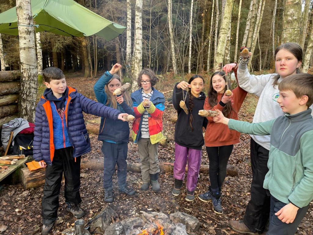 All our teamwork and nature connection is through games – also in Autumn we played a big game on a loop of night and day, with challenges and obstacles to overcome, treasures were hidden, storms came over that damaged their shelter and foxes came in to eat their food while they were sleeping. Children had to work together, recognising the value of individual contribution, as well as being resilient, making their shelter stronger. We picked the last of the brambles and made flapjacks in dock leaves over the fire.