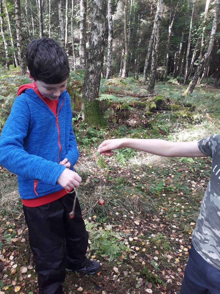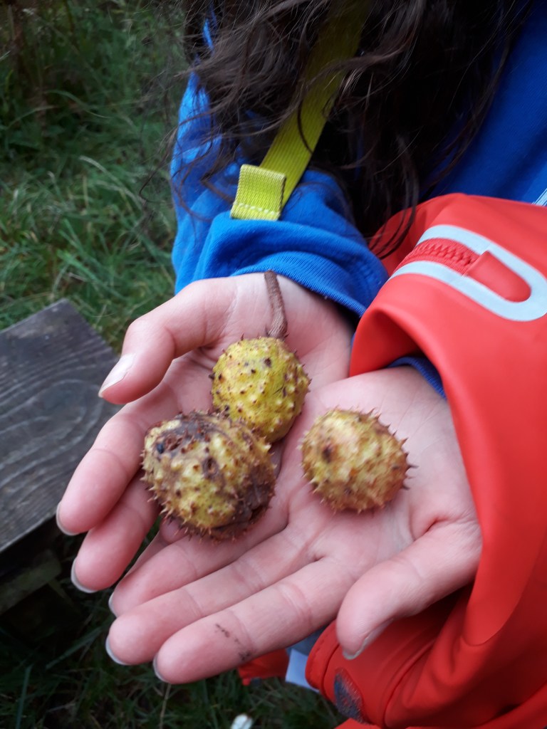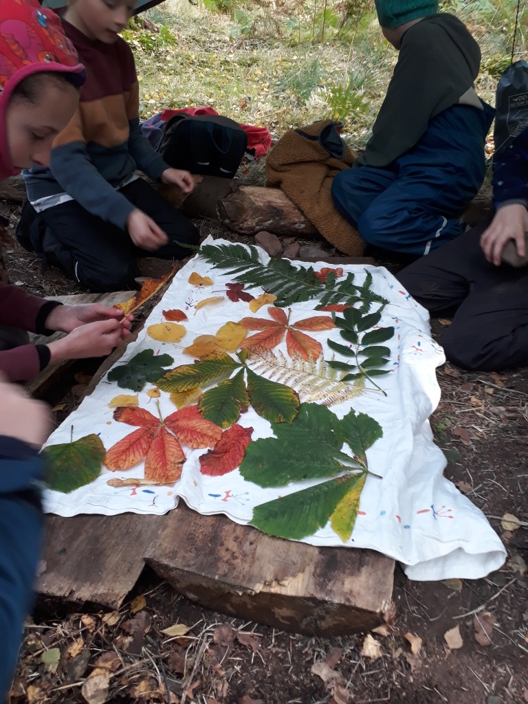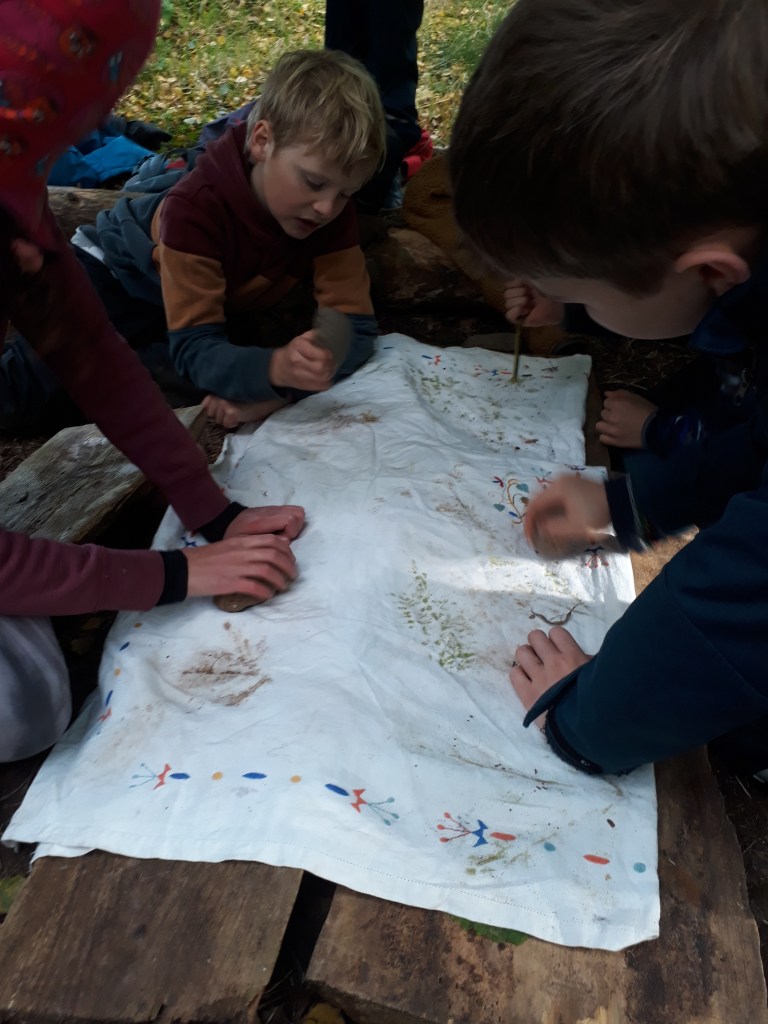 We love the Autumn colours – we have games to help us notice the differences in leaves. We also use them to craft decorations for our dens – bashing them in fabric with a rock.